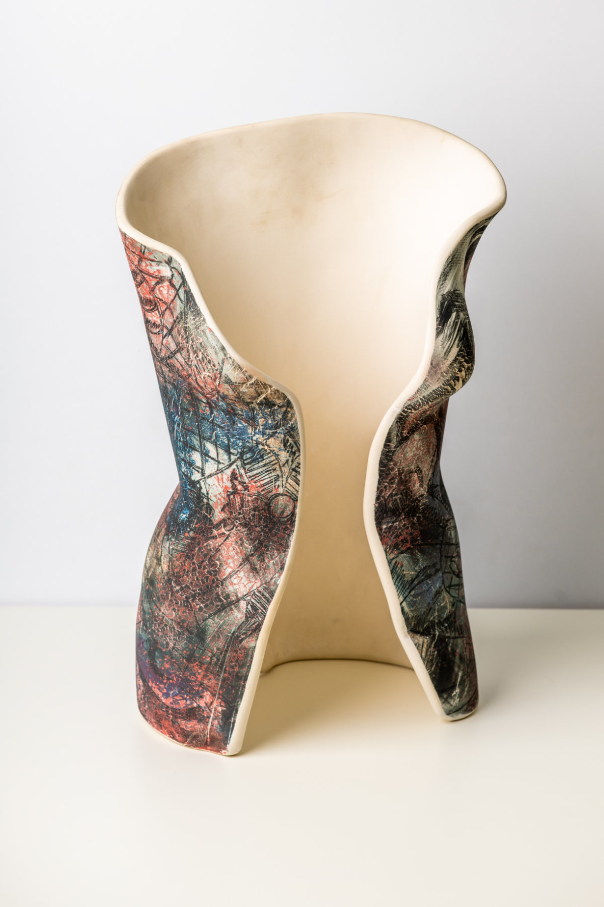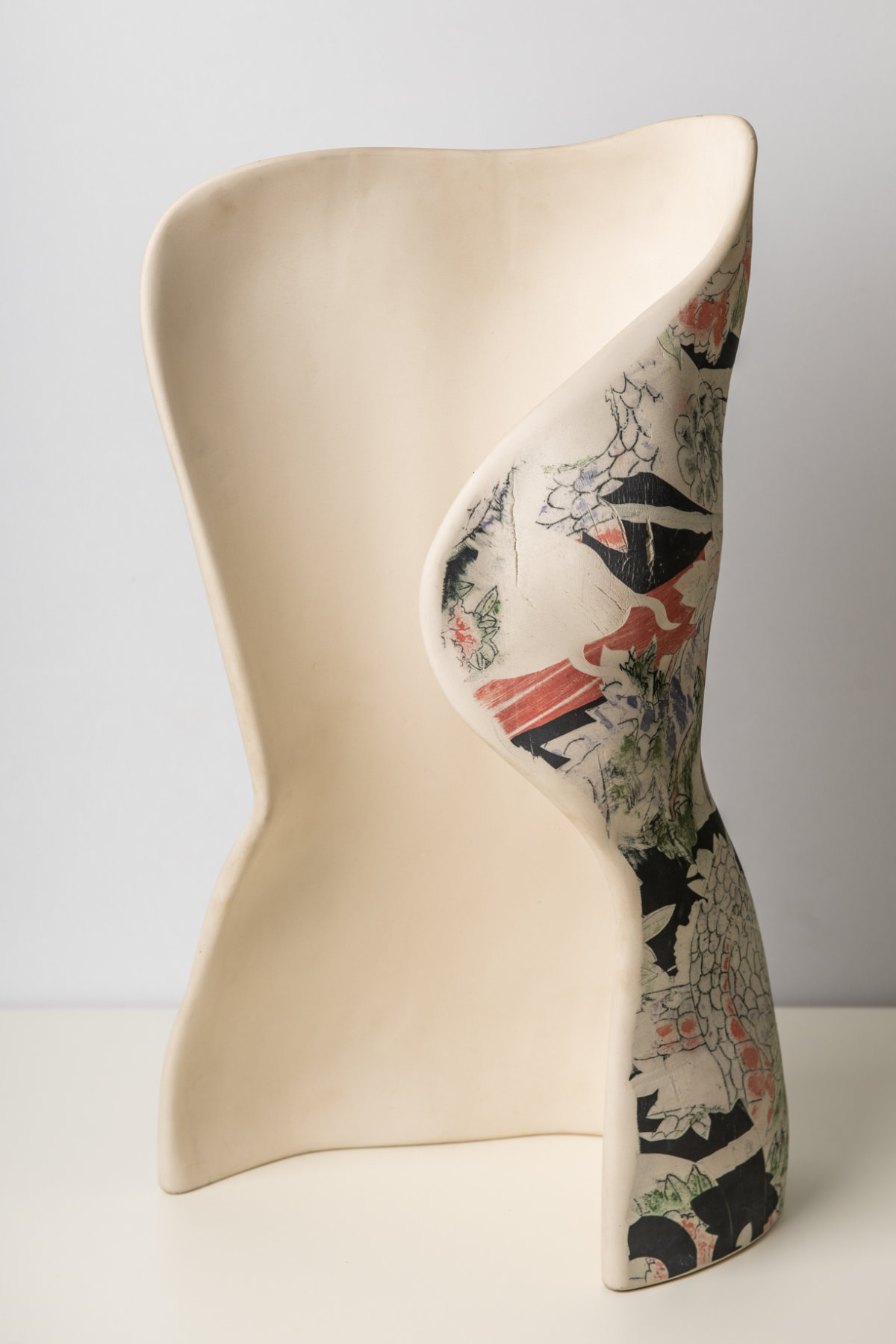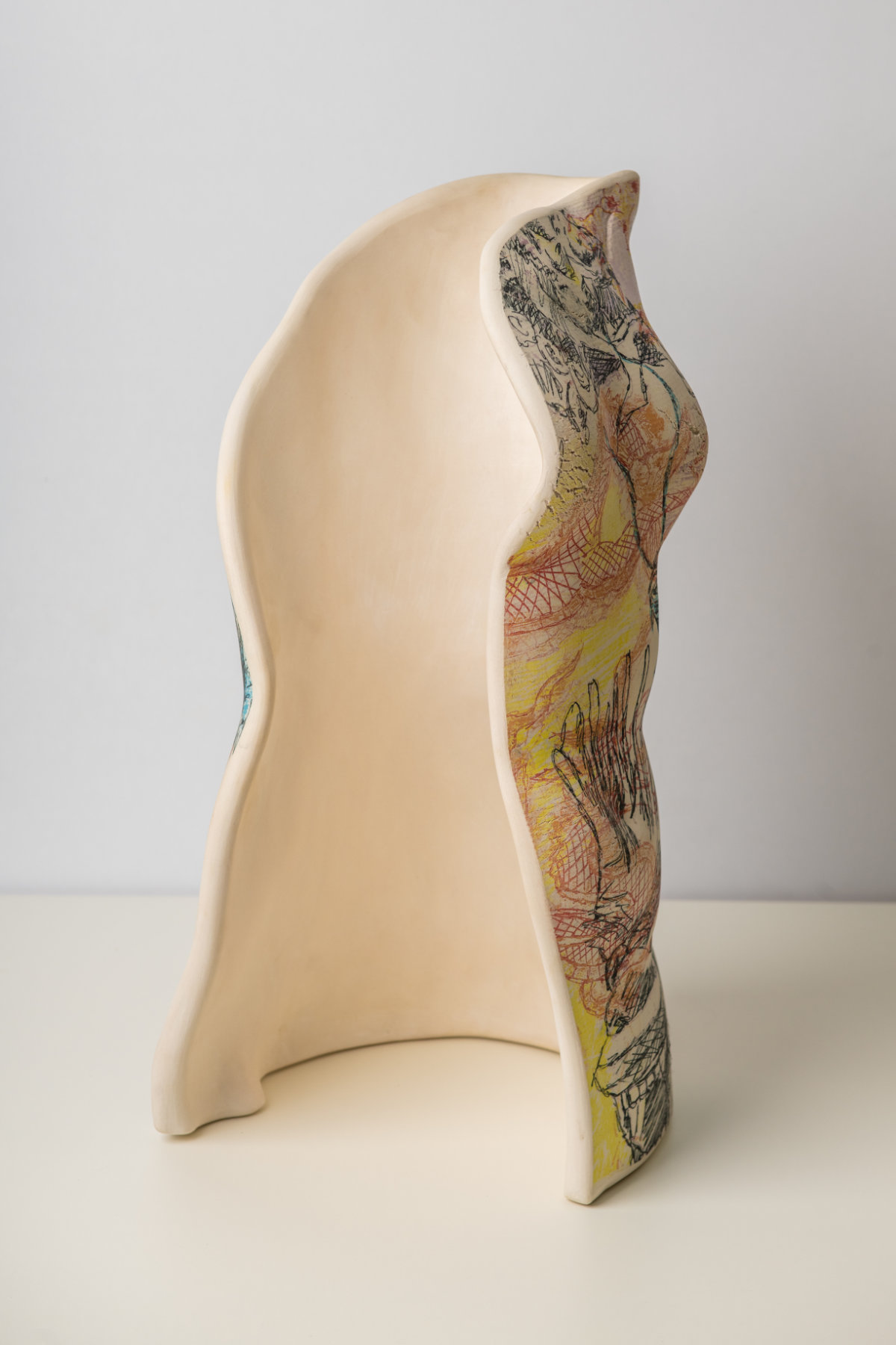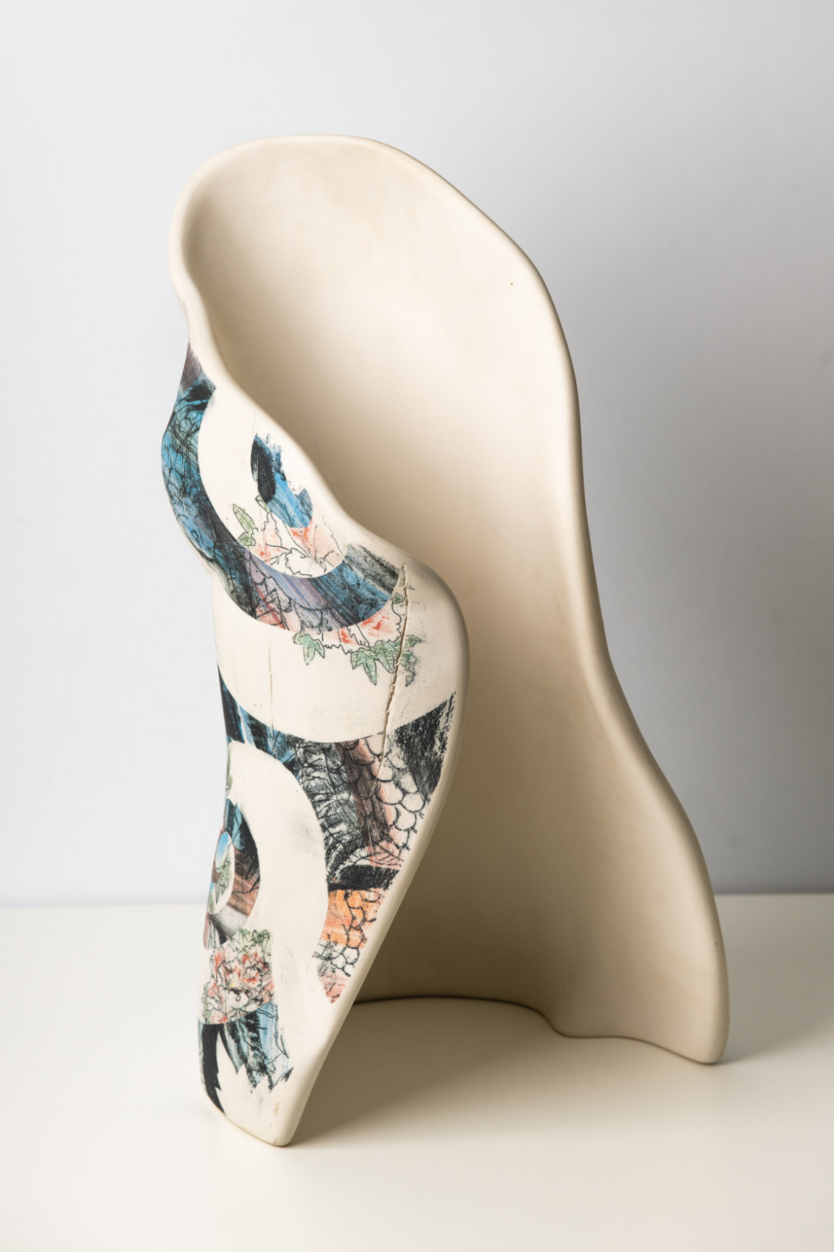 Le contraste entre l’intérieur blanc de la pièce, fait de porcelaine pure, et l’extérieur coloré, orné de motifs inspirés du tatouage traditionnel, symbolise la dualité entre la fragilité et la force, entre la surface et l’intimité. Ce jeu de textures et de couleurs souligne l’ambivalence de la condition féminine, entre la fragilité du corps et la puissance d’une identité façonnée par le tatouage.