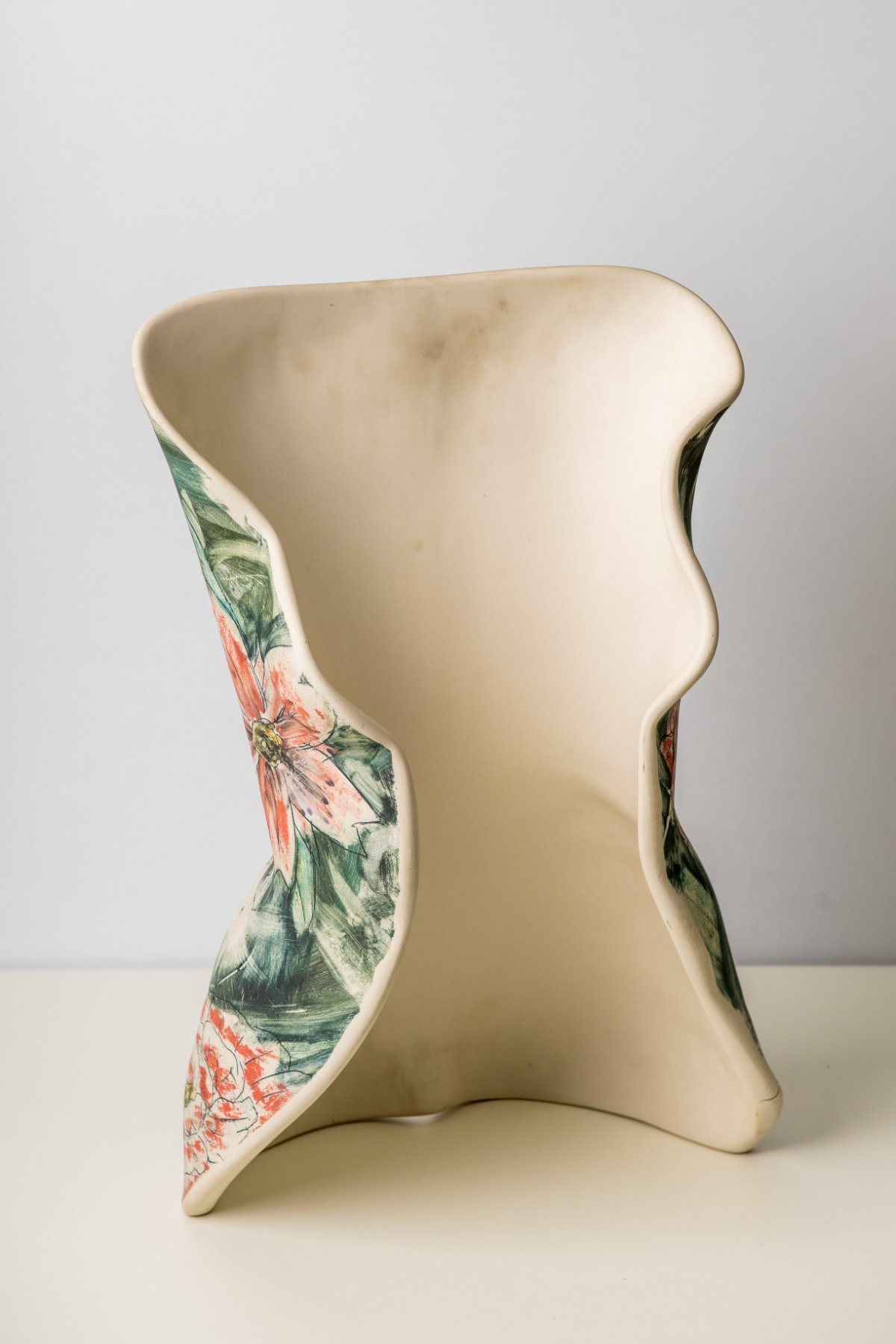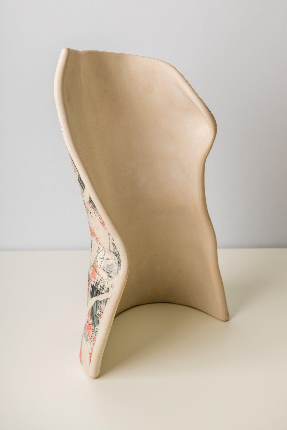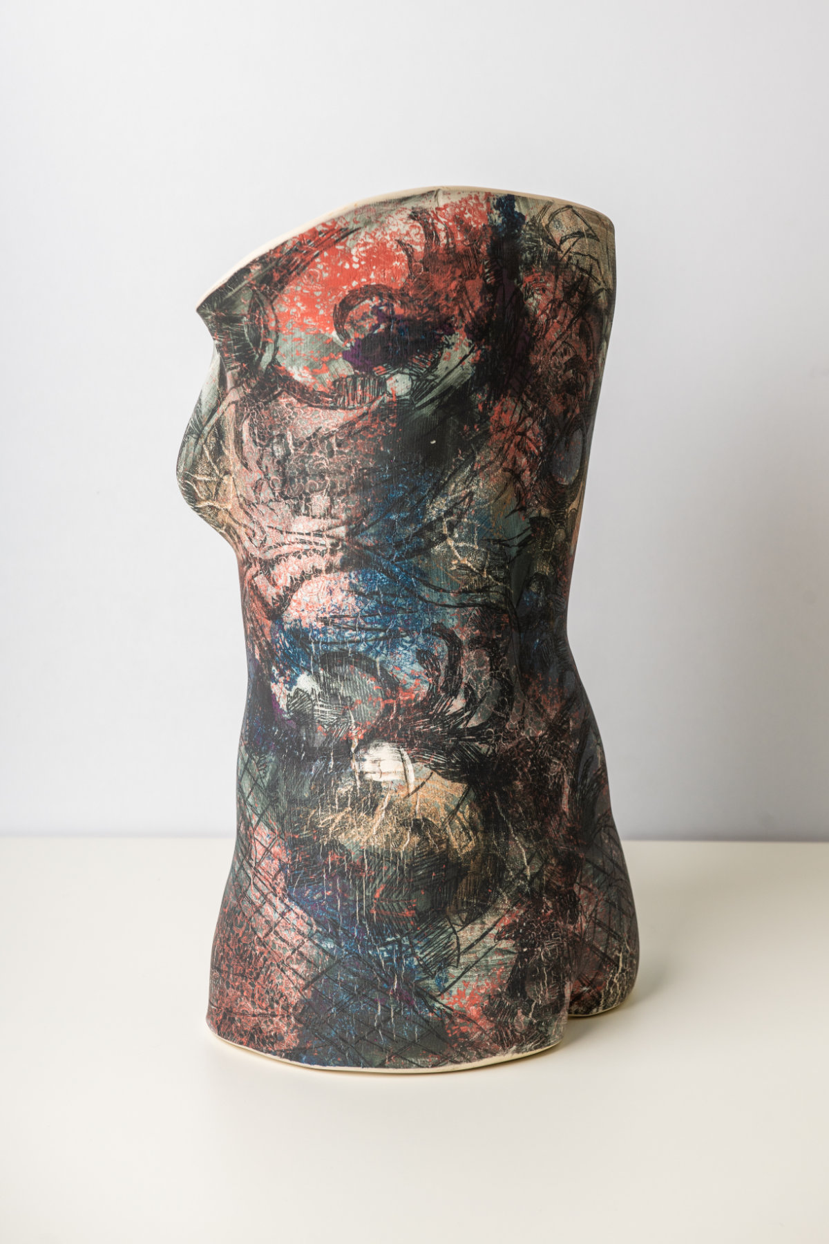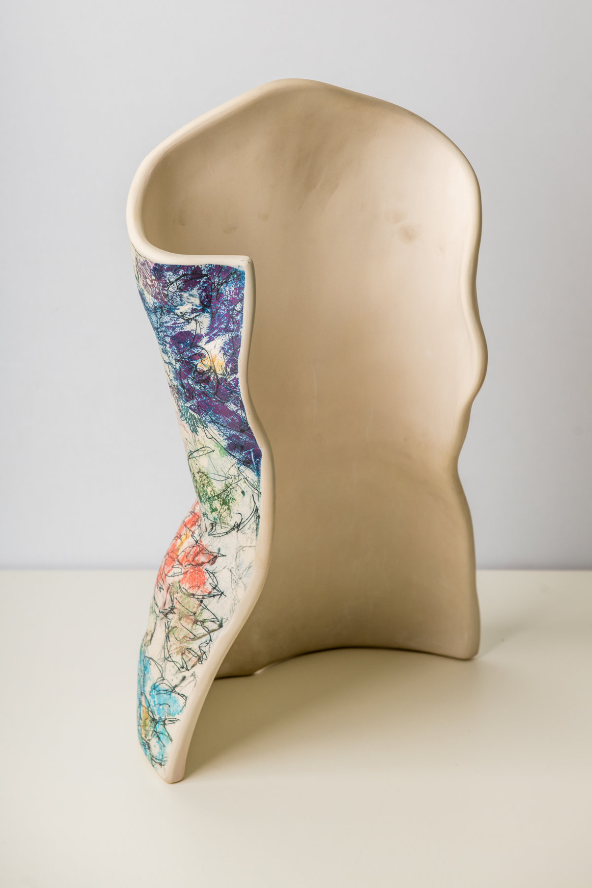 Le contraste entre l’intérieur blanc de la pièce, fait de porcelaine pure, et l’extérieur coloré, orné de motifs inspirés du tatouage traditionnel, symbolise la dualité entre la fragilité et la force, entre la surface et l’intimité. Ce jeu de textures et de couleurs souligne l’ambivalence de la condition féminine, entre la fragilité du corps et la puissance d’une identité façonnée par le tatouage.