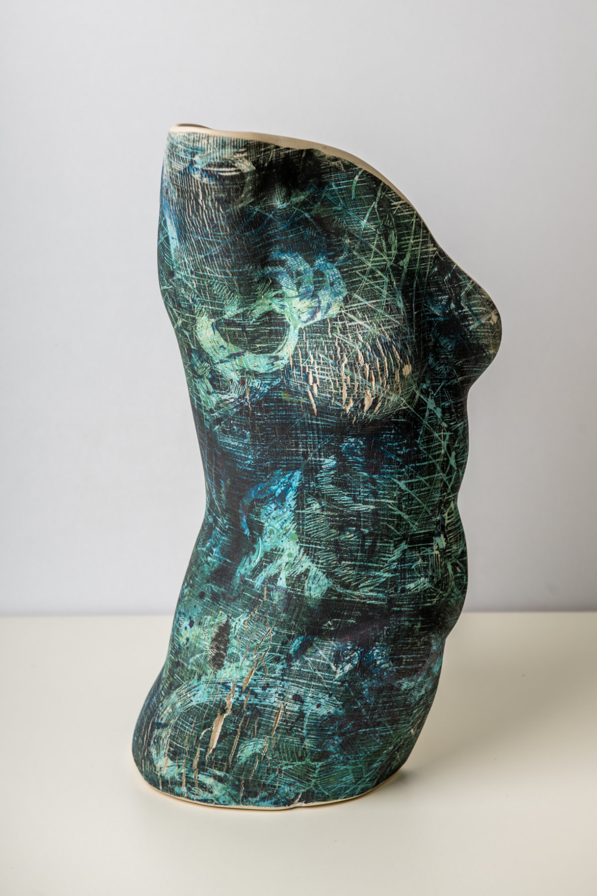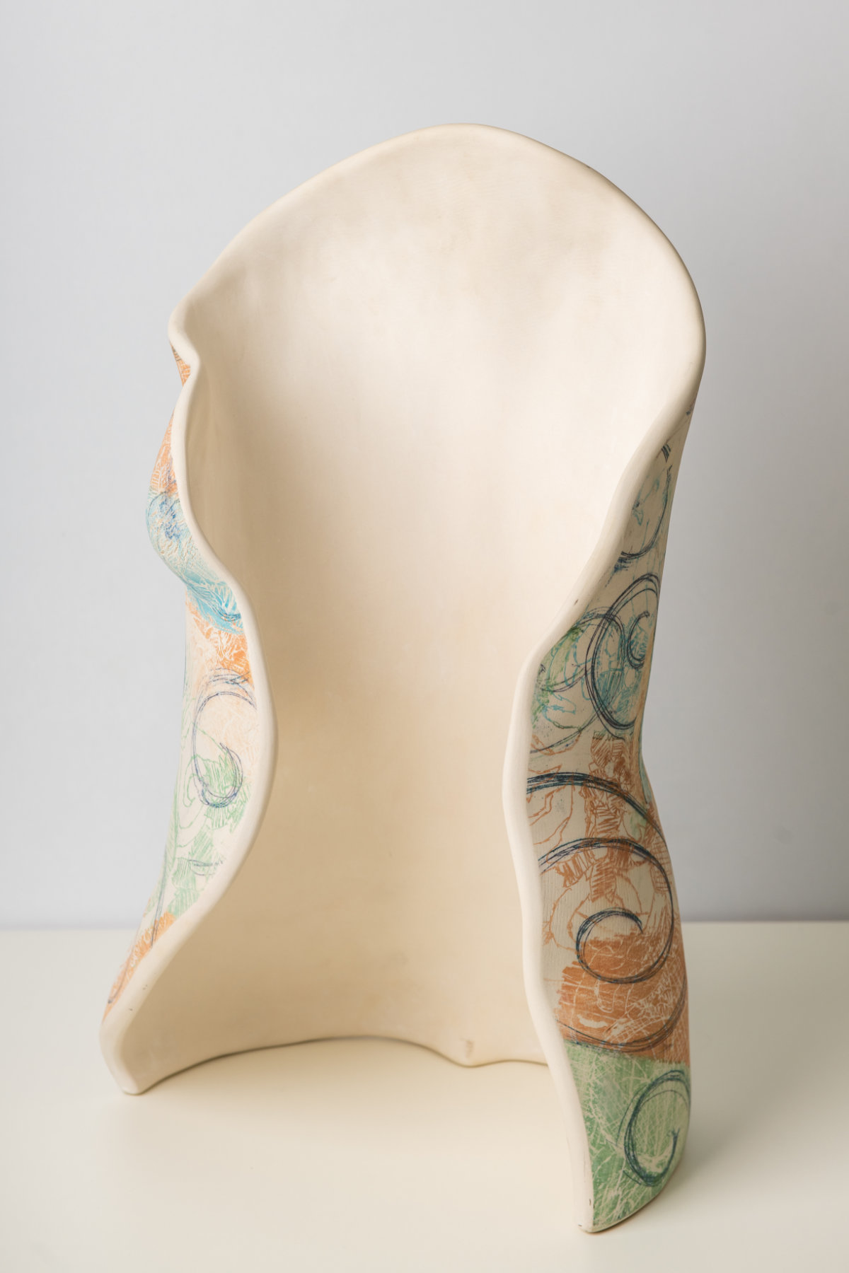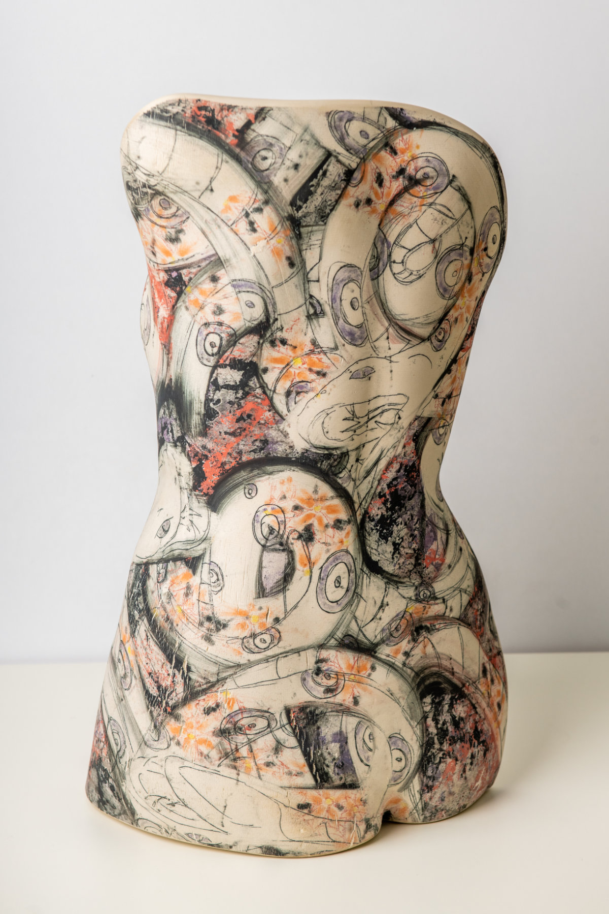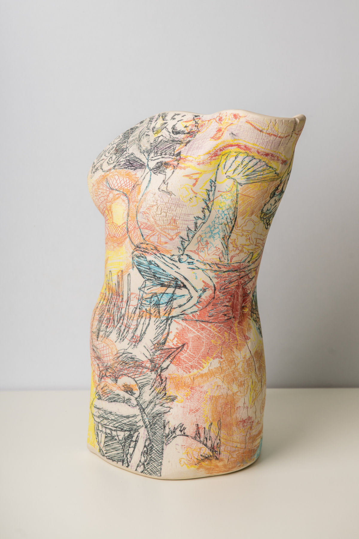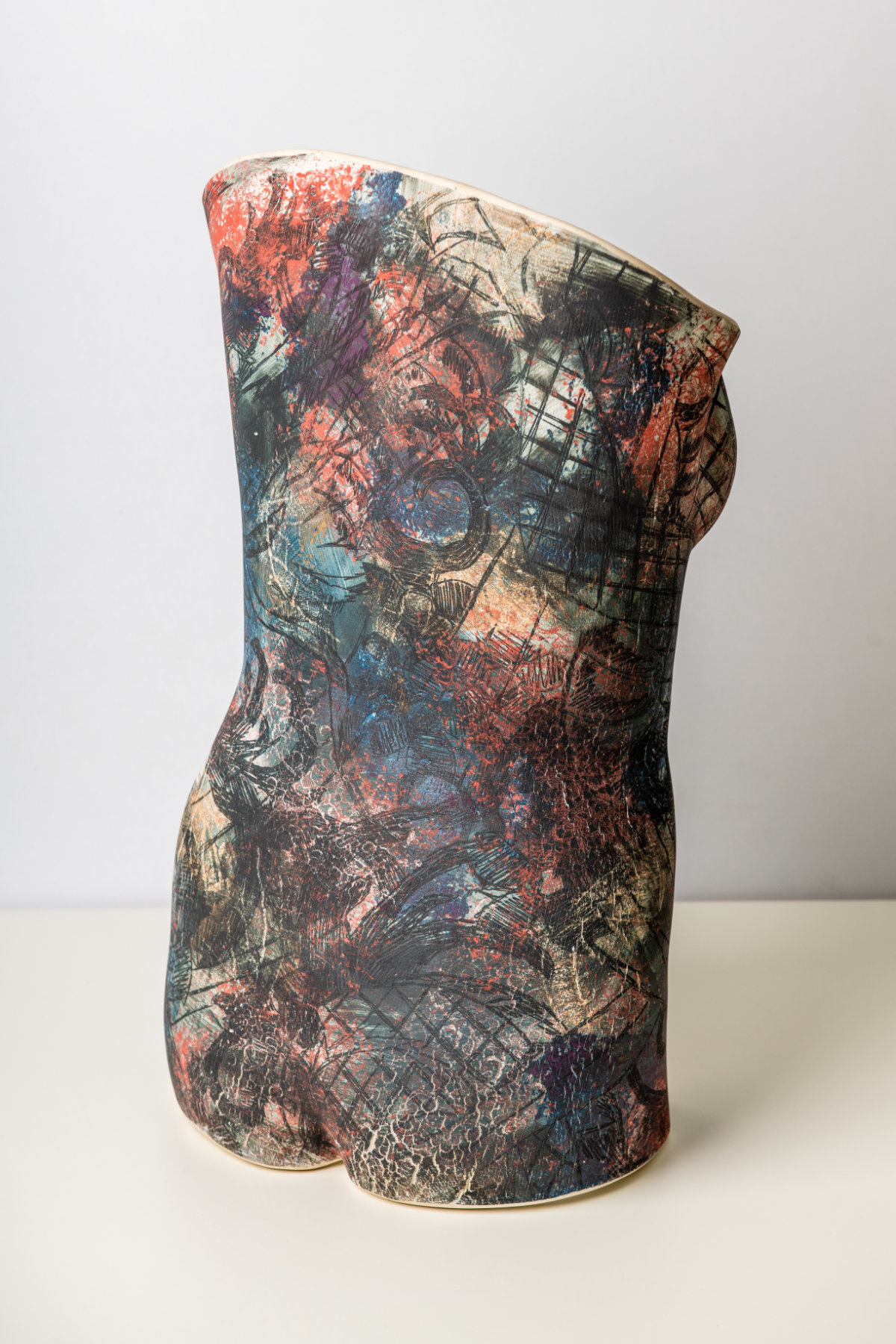 Le contraste entre l’intérieur blanc de la pièce, fait de porcelaine pure, et l’extérieur coloré, orné de motifs inspirés du tatouage traditionnel, symbolise la dualité entre la fragilité et la force, entre la surface et l’intimité. Ce jeu de textures et de couleurs souligne l’ambivalence de la condition féminine, entre la fragilité du corps et la puissance d’une identité façonnée par le tatouage.