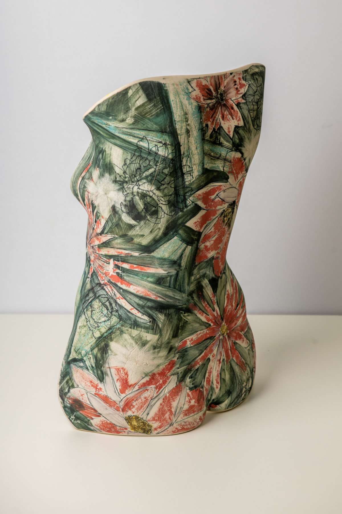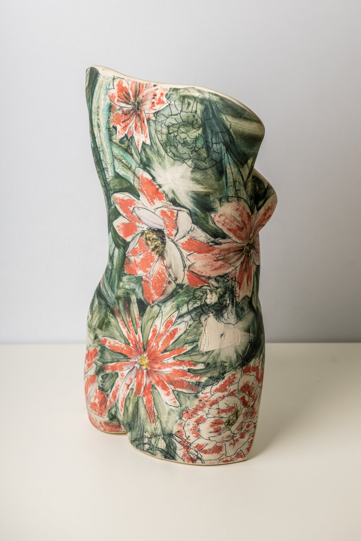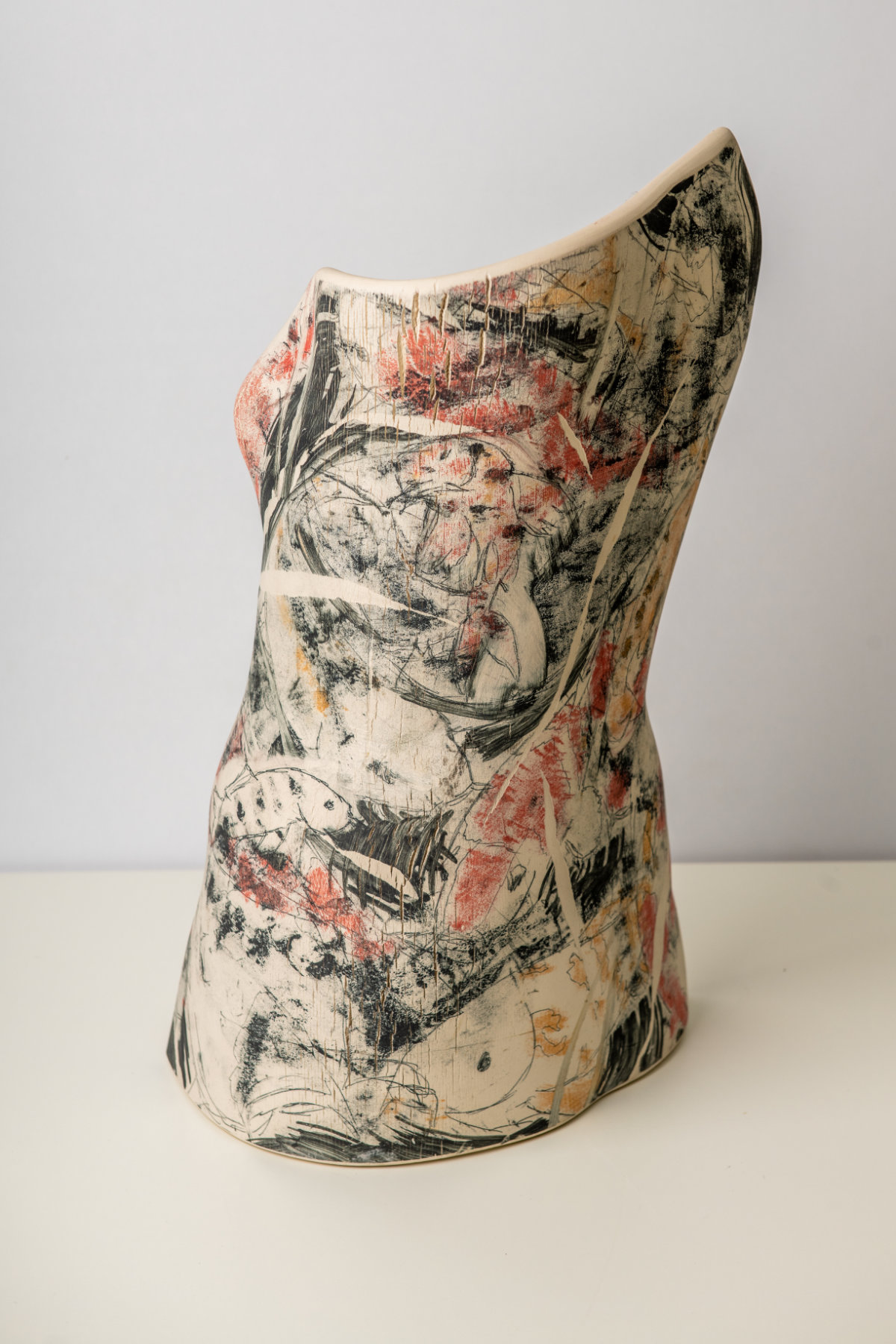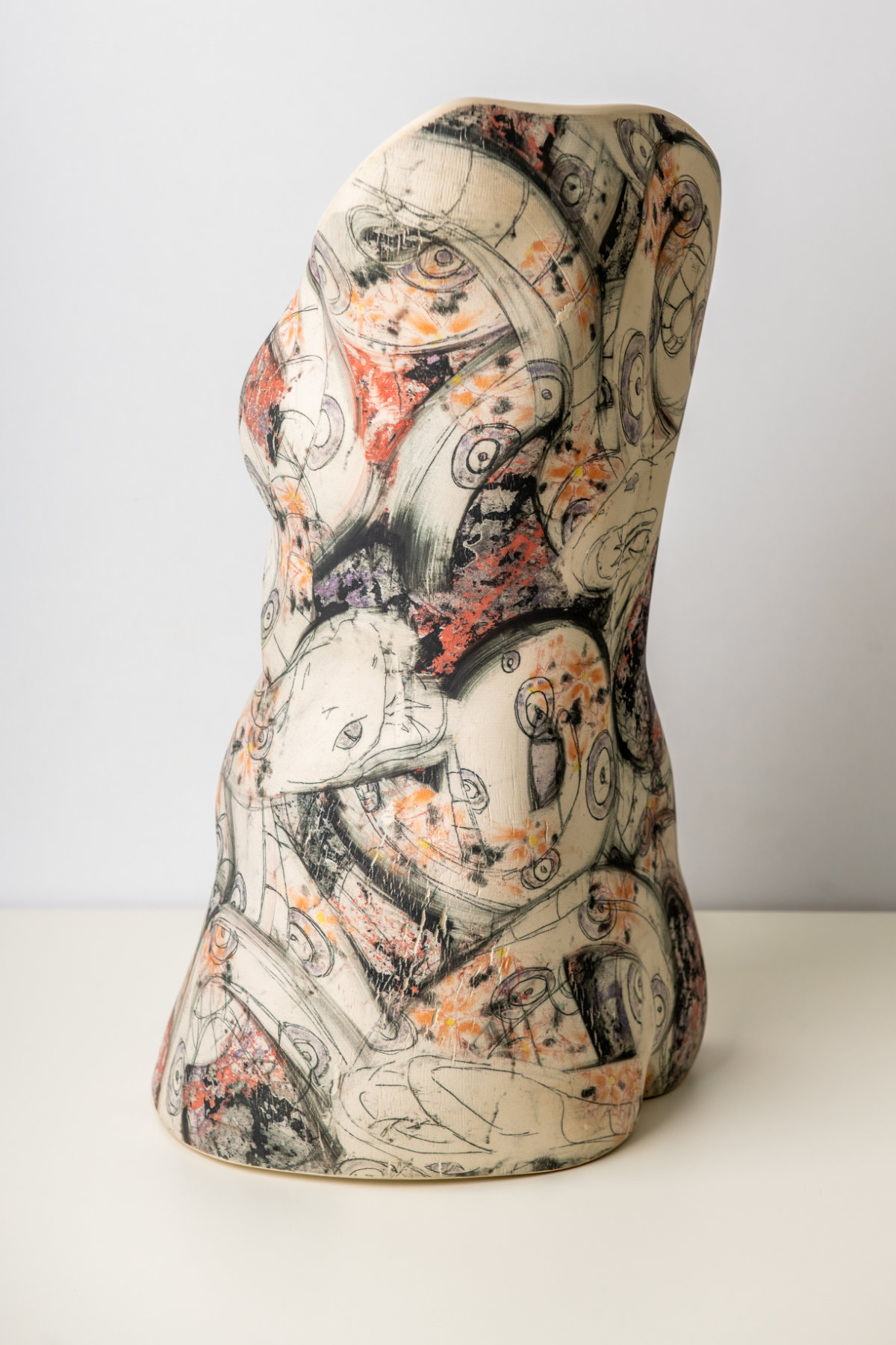 Le contraste entre l’intérieur blanc de la pièce, fait de porcelaine pure, et l’extérieur coloré, orné de motifs inspirés du tatouage traditionnel, symbolise la dualité entre la fragilité et la force, entre la surface et l’intimité. Ce jeu de textures et de couleurs souligne l’ambivalence de la condition féminine, entre la fragilité du corps et la puissance d’une identité façonnée par le tatouage.